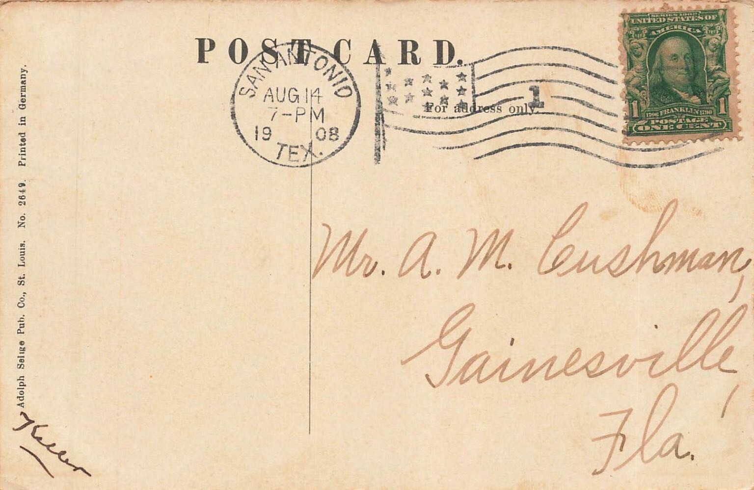 This captivating vintage postcard transports you to San Antonio, Texas, circa 1908, featuring the magnificent Carnegie Library. The architectural grandeur of the building is prominently displayed, with its distinctive red brick, classical columns, and elegant design. A horse-drawn carriage on the street adds a nostalgic touch, perfectly capturing the essence of early 20th-century urban life.Published by Adolph Selige Pub. Co. of St. Louis and printed in Germany, this postcard showcases the detailed chromolithography popular during the era. The reverse side features a clear San Antonio postmark from August 14, 1908, and is addressed to Gainesville, Florida, making it a wonderful piece of postal history. This collectible item is ideal for enthusiasts of Texas history, vintage architecture, or postcard collecting, offering a glimpse into the past.