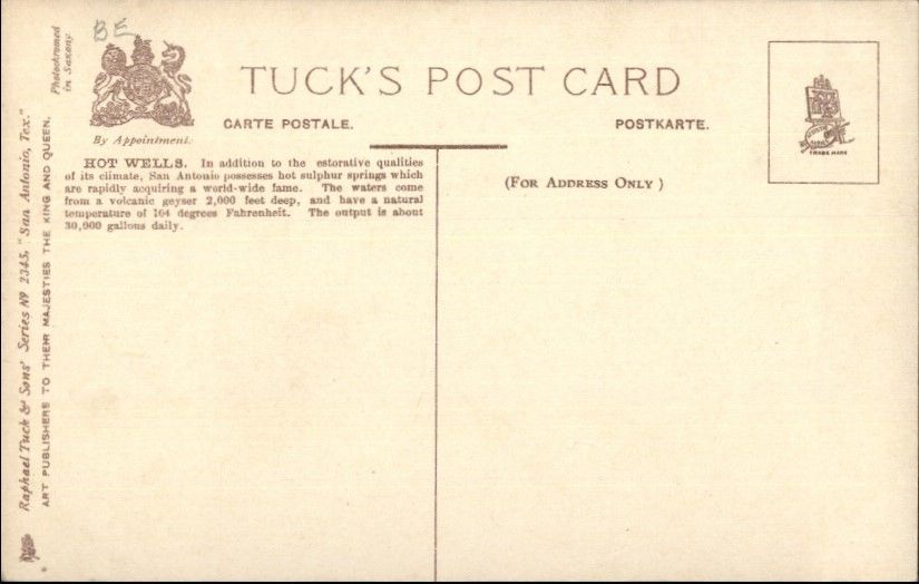 San Antonio TX Hot Wells TUCK c1910 Postcard EXC COND