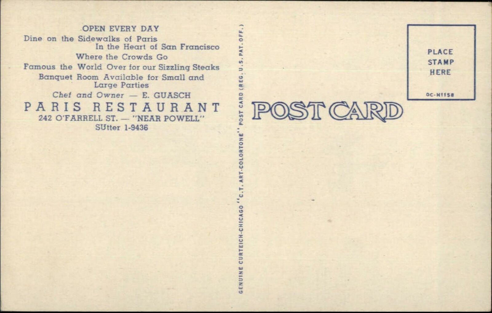 San Francisco CA Paris Restaurant Linen Advertising Postcard