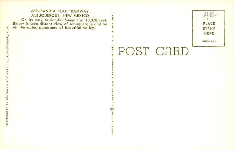 Sandia Peak Tramway Albuquerque, New Mexico NM Postcard - Unused Grade: 1 Size: R - Regular Size Postcard - approximately 3 1/2 inch x 5 1/2 inch (9 CM x 14 CM) Grading Scale: Grade 1 = Perfect corners Grade 2 ... Read More