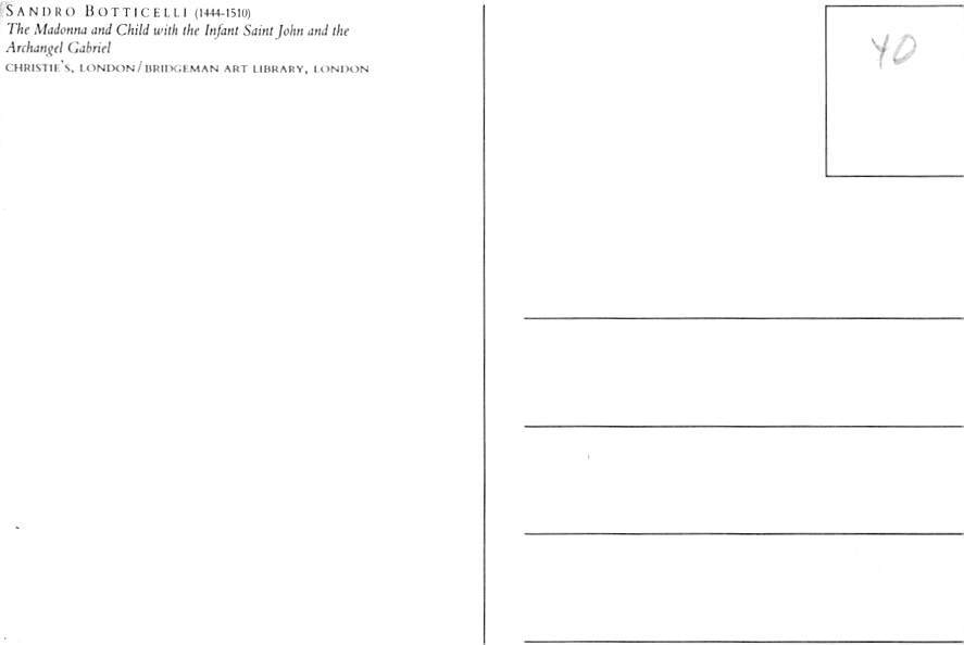 Sandro Botticelli, The Madonna And The Child Postcard - View Images Grade: 1 Size: C - Continental Size Postcard - approximately 4 inch X 6 inch (15 CM X 10.5 CM) Grading Scale: Grade 1 = Perfect corners Grade ... Read More