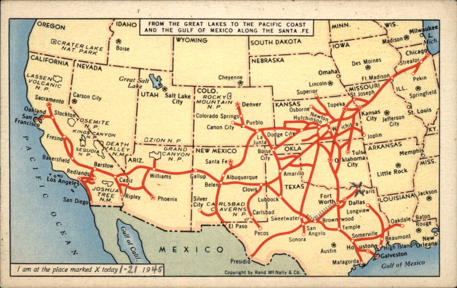 Santa Fe Railway Map Paris Texas Mark c1930-50s Vintage Postcard