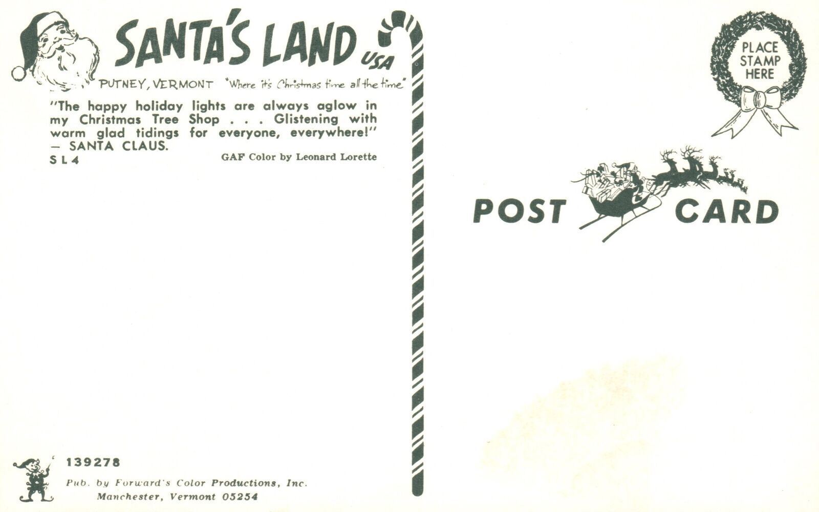 Santa's Land Happy Holiday Aglow Christmas Tree Shop Putney VT Vintage Postcard