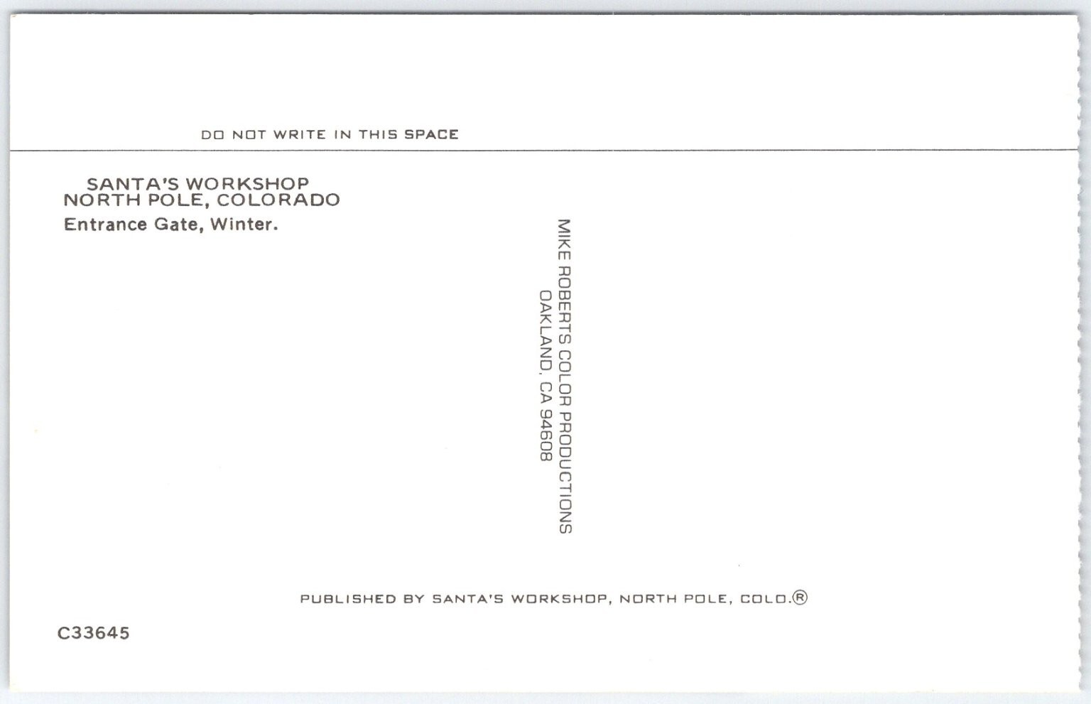 This vintage postcard features the iconic entrance gate to Santa's Workshop in North Pole, Colorado, captured during winter. The image showcases a charming wooden archway adorned with a festive display of Santa Claus and his reindeer on the roof, set against a backdrop of snow-covered pine trees and a bright blue sky. This scenic view perfectly embodies the holiday spirit and the whimsical allure of this well-known family attraction.Printed by Mike Roberts Color Productions and published by Santa's Workshop, North Pole, Colo., this postcard is an original paper card with vibrant color printing typical of mid-20th century production. The postcard's back identifies it as a winter scene, emphasizing its seasonal appeal. Collectors and holiday enthusiasts alike will appreciate this nostalgic depiction of a beloved Christmas landmark in the Rocky Mountains, making it a unique addition to any postcard or Christmas memorabilia collection.