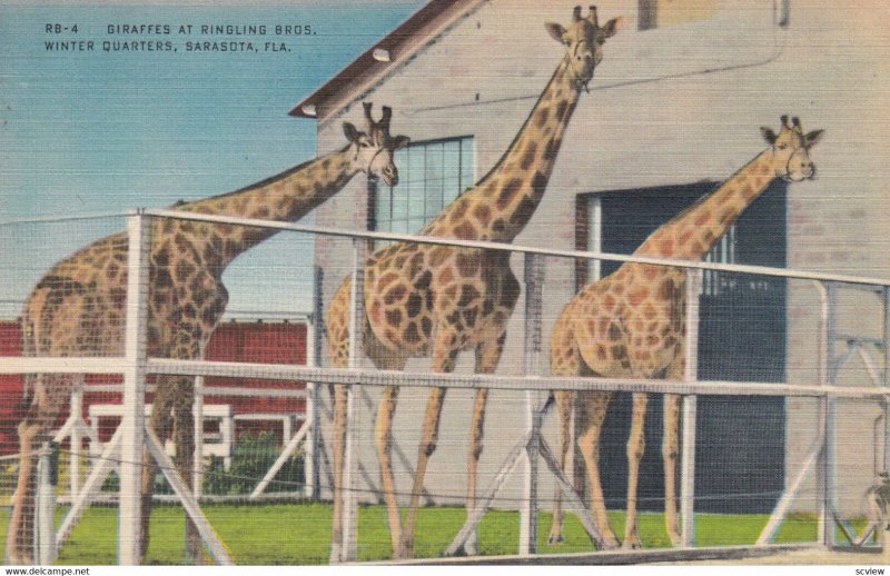 SARASOTA , Florida , 1930-40s ; Circus Giraffes :: Postcard, 3.5" by 5.5", Linen