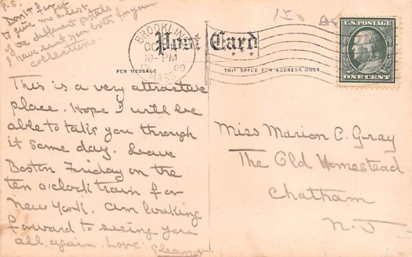 Sargent Place Brookline, Massachusetts Postcard - 1909 Grade: 4 Size: R - Regular size: Approx 3 1/2 X 5 1/2 inch (9 cm X 14 cm) Grading Scale: Grade 1 = Perfect corners Grade 2 = Very Minimal corner wear, no ... Read More