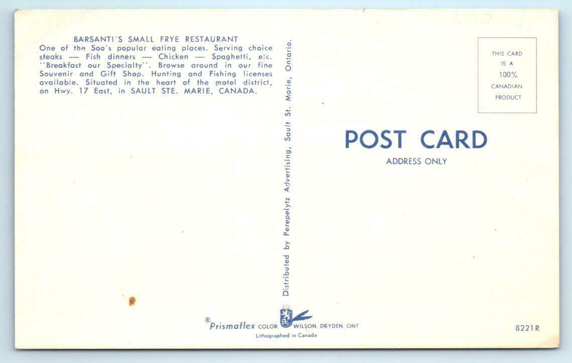 SAULT STE. MARIE, Canada ~ Roadside BARSANTI'S SMALL FRYE Restaurant Postcard