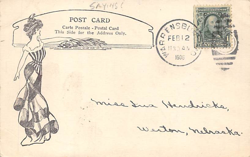 Saying Postcard 1906, Grade: 3 - writing on front, tab marks on corners, , Size: Regular size: Approx 3 1/2 X 5 1/2 inch (9 cm X 14 cm) Grading Scale: Grade 1 = Perfect corners Grade 2 = Very Minimal corner we ... Read More
