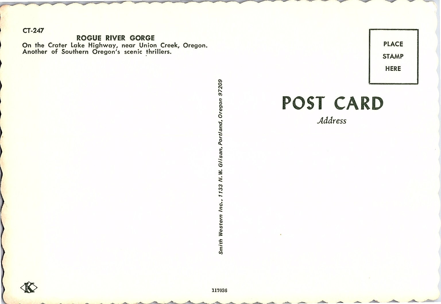 This vintage postcard features a stunning color photochrome image of the Rogue River Gorge, located on the Crater Lake Highway near Union Creek, Oregon. Capturing the powerful flow of the Rogue River as it rushes through the rocky gorge, this postcard offers a glimpse into one of Southern Oregon's scenic natural wonders. The vibrant colors and detailed lithographic printing highlight the rugged terrain and lush greenery surrounding the river, making it a captivating collectible piece.Published by Smith Western Inc., Portland, Oregon, this postcard is a licensed reprint from the 1960s era, showcasing the popular photochrome technique that brought color photography to postcards during that period. Measuring the standard continental size of approximately 6 x 4 inches, the card displays scalloped edges typical of mid-century postcard design. Perfect for collectors of Oregon memorabilia, scenic postcards, or vintage photochrome prints, this card celebrates the beauty and adventure of the Rogue River area.