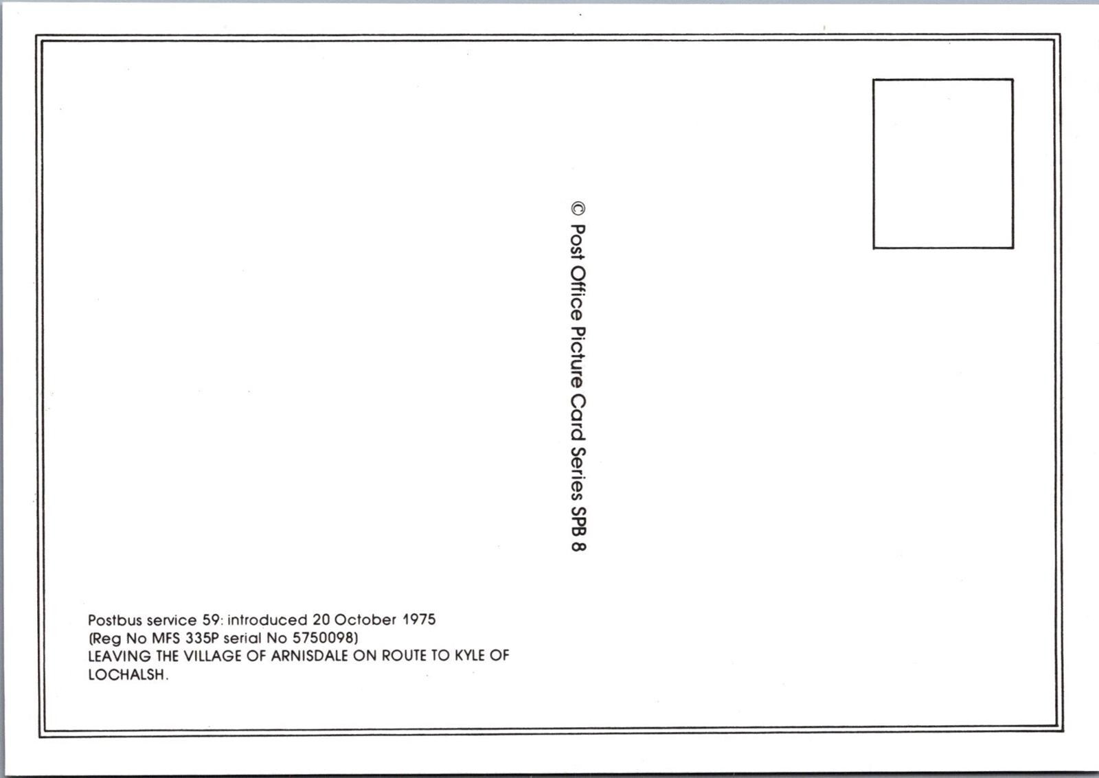 This is a Scotland Postcard - Postbus Leaving Arnisdale Village Ref.SW9983 Publisher: Post Office Picture CardPostcard size: ContinentalPostcard defect(s): Please also use the image magnifier to make your own assess ... Read More