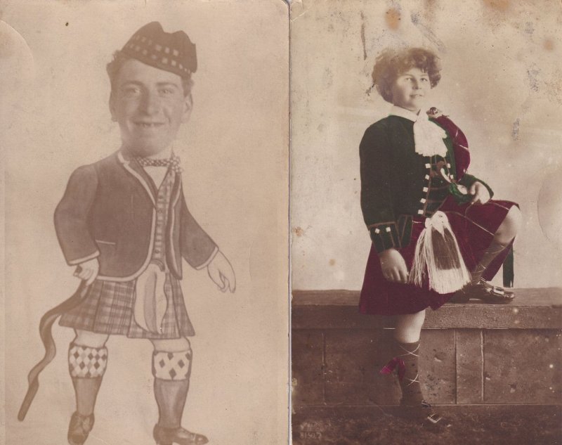 ts121 Antique comic postcard of this Scottish man in a fancy dress seaside beach display - his real face is missing a tooth (has black space) - he holds a very wonky walking stick - must date around 1904 - shows aging and only fair condition (comes with second postcard of a Scottish girl - part of this collection also a portrait - aged condition due to discolouration so only fair to good) - these are two great real photo postcards of the very early 1900s