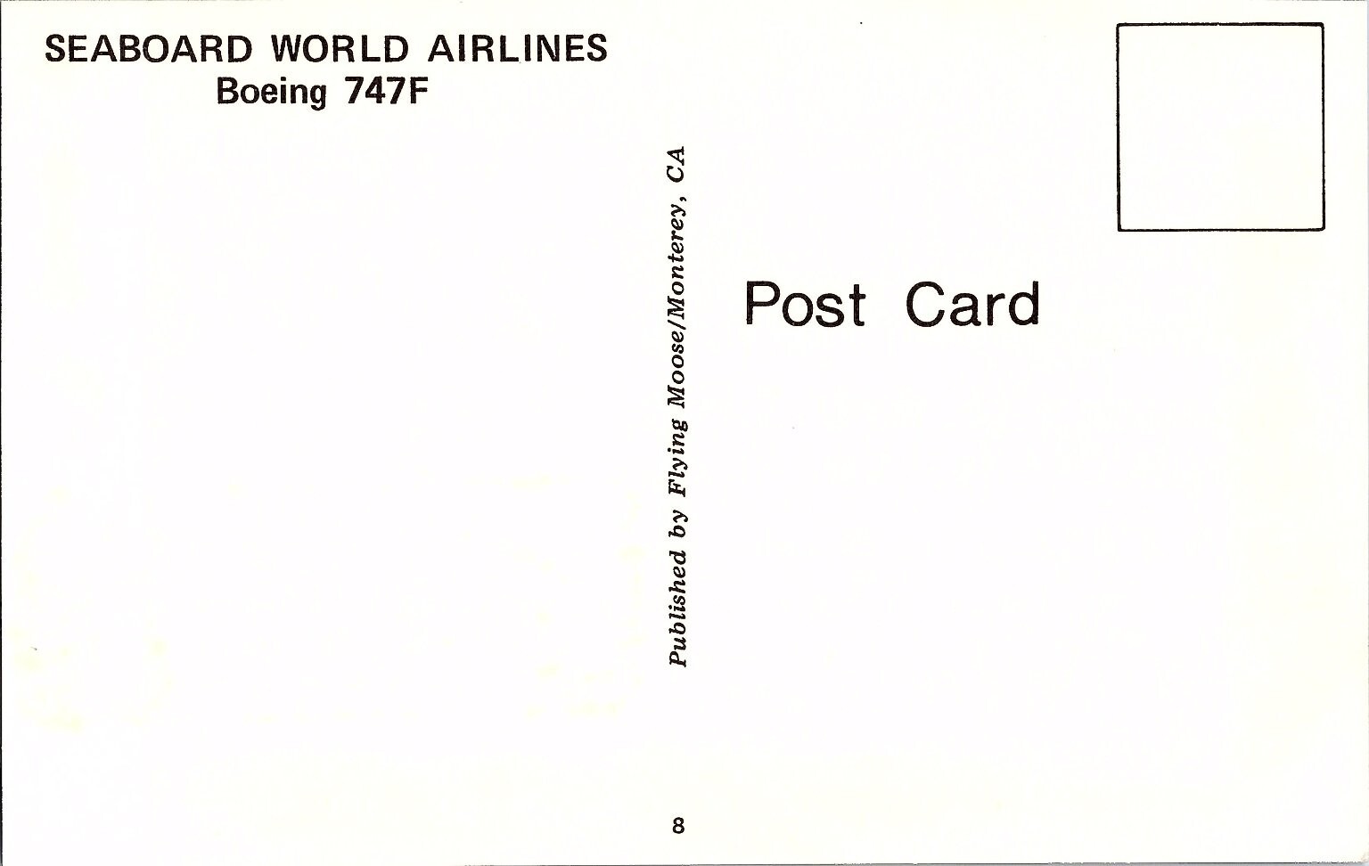 Condition: Pre-owned. With mild edgewear. Typical. This vintage postcard features a striking black and white photochrome image of a Seaboard World Airlines Boeing 747F, a renowned cargo aircraft, soaring above a d ... Read More