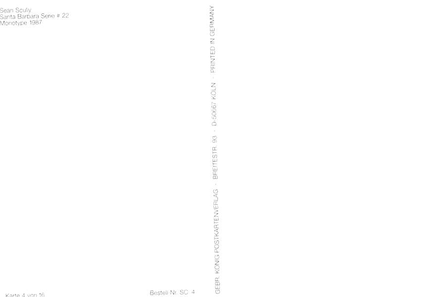 Sean Scully - Santa Barbara Grade: 1 Category: Continental Size Postcard, Approx 4 in x 6 in (10 cm x 15.25 cm) Product Size: Continental size: 4X6 inches (10.5 cm x 15 cm) Grading Scale: Grade 1 = Perfect cor ... Read More