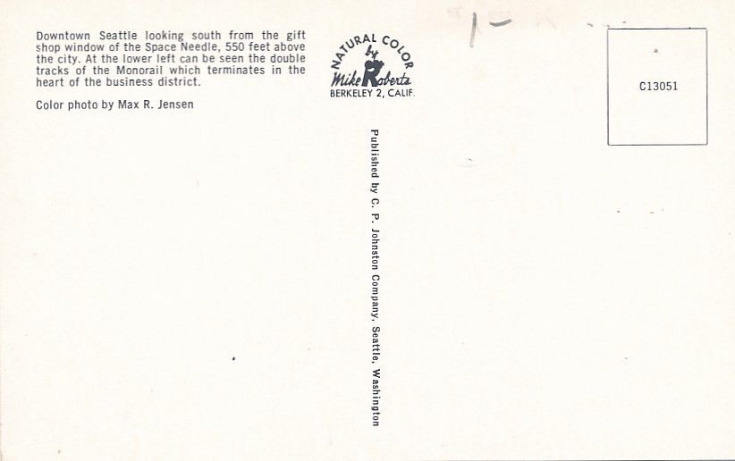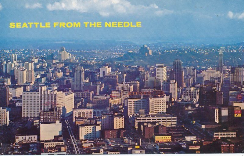 Seattle, Washington - View form The Needle Gift Shop. Standard sized chrome card. Natural Color by Mike Roberts of Berkeley CA. Excellent condition.