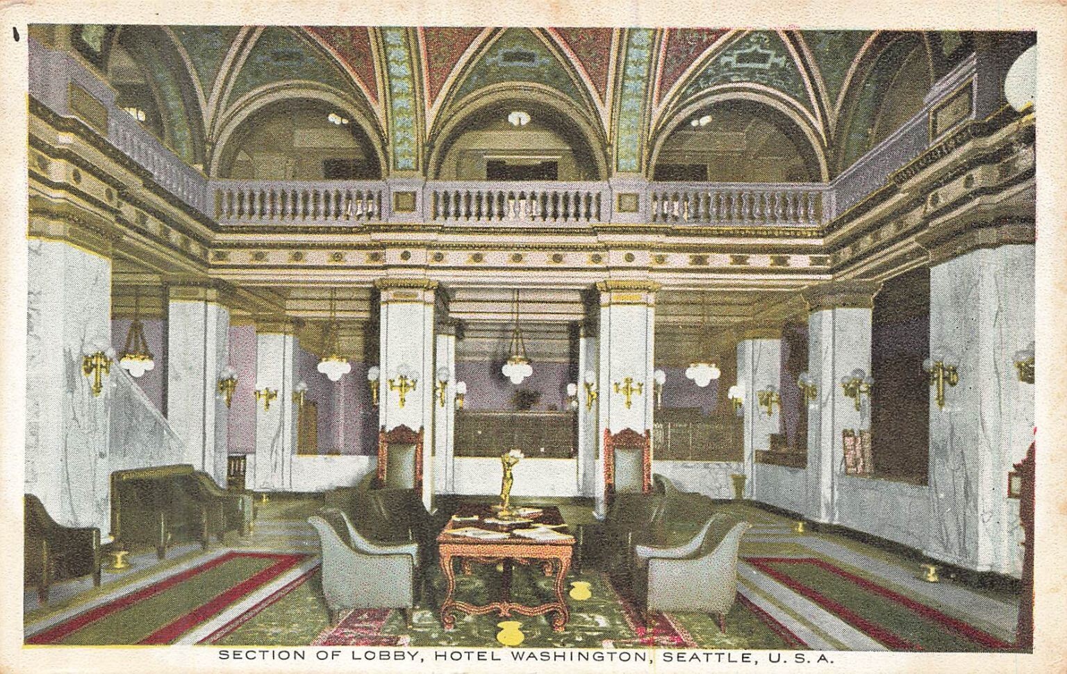 Step back in time to the opulent Hotel Washington in Seattle, Washington, with this captivating vintage postcard. The card showcases a grand section of the hotel's luxurious lobby, a testament to early 20th-century architectural elegance and interior design. Marvel at the intricate details of the high vaulted ceilings, majestic arches, and elegant balconies that define the space. The scene is further enhanced by ornate chandeliers, substantial columns, and classic furnishings, including plush armchairs and a finely carved table, all contributing to an atmosphere of sophisticated grandeur.This collectible piece provides a unique glimpse into a bygone era of American hospitality and design. Printed by the White Advertising Bureau, Inc., located in the Hancock Bldg., Seattle, it represents a significant piece of Seattle's rich history and postcard publishing heritage. The card features a standard divided back, ready for correspondence and address, making it a wonderful addition for collectors of hotel memorabilia, Seattle history, or vintage architectural postcards.