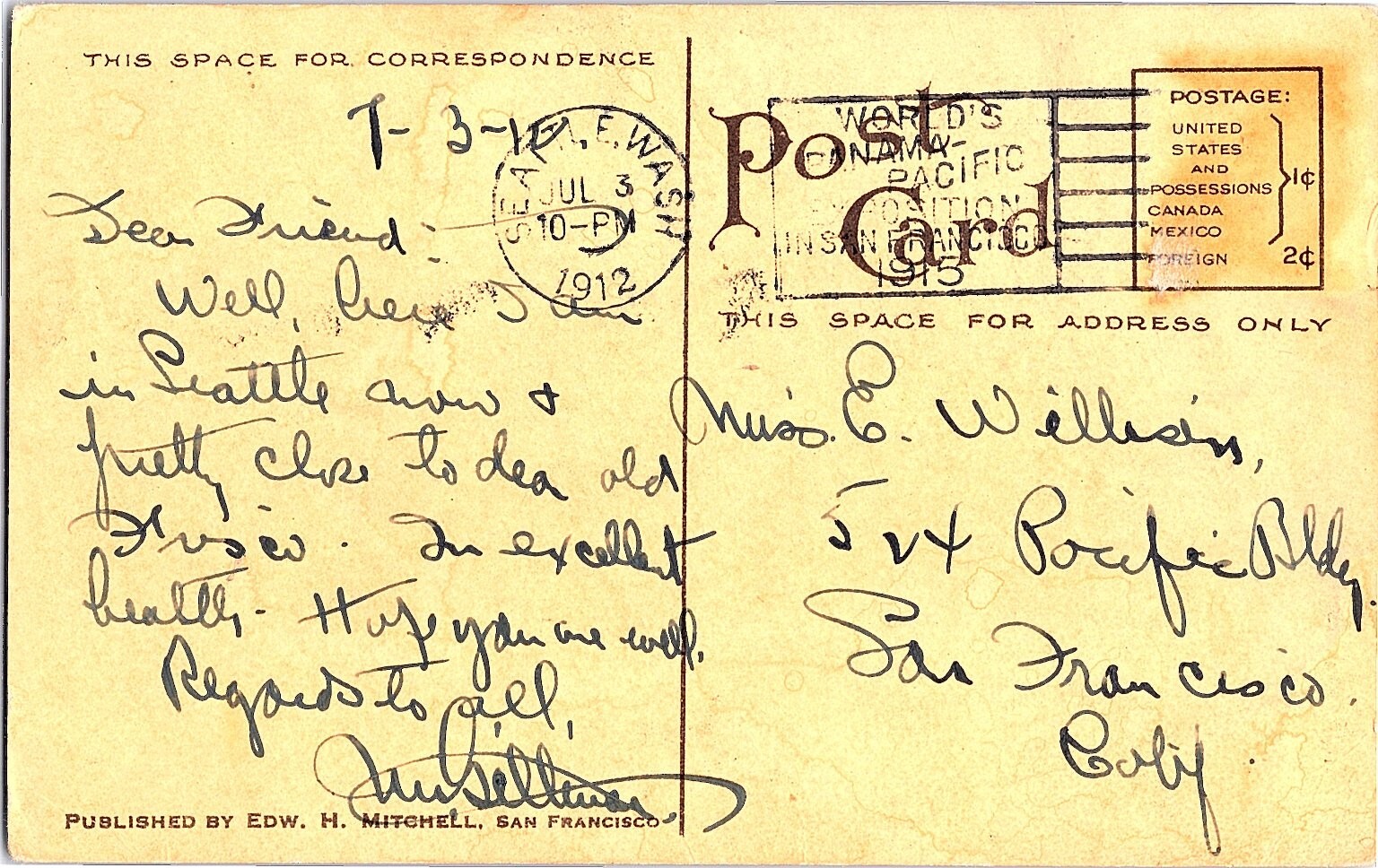 This vintage postcard features a sepia-toned view of Seattle, Washington as it appeared in 1874, looking south from 2nd Ave & Pine. The image showcases the early development of the city with its modest buildings and surrounding natural landscape, capturing a historical snapshot before Seattle's significant growth. The postcard is a licensed reprint produced in the Photochrome era (1939 to present), known for its realistic color reproduction techniques that enhanced early black-and-white images.Published by Edw. H. Mitchell of San Francisco, a well-known publisher of postcards in the early 20th century, this card reflects a slice of American West Coast history. The reverse side bears handwritten correspondence dated July 3, 1912, and a postal cancellation mark from Seattle, adding collectible postal history value. This postcard is a continental size (6 x 4 inches) made of paper, featuring chrome finish typical of mid-20th century postcards. It is ideal for collectors of historical city views, vintage postcards, and Seattle memorabilia.