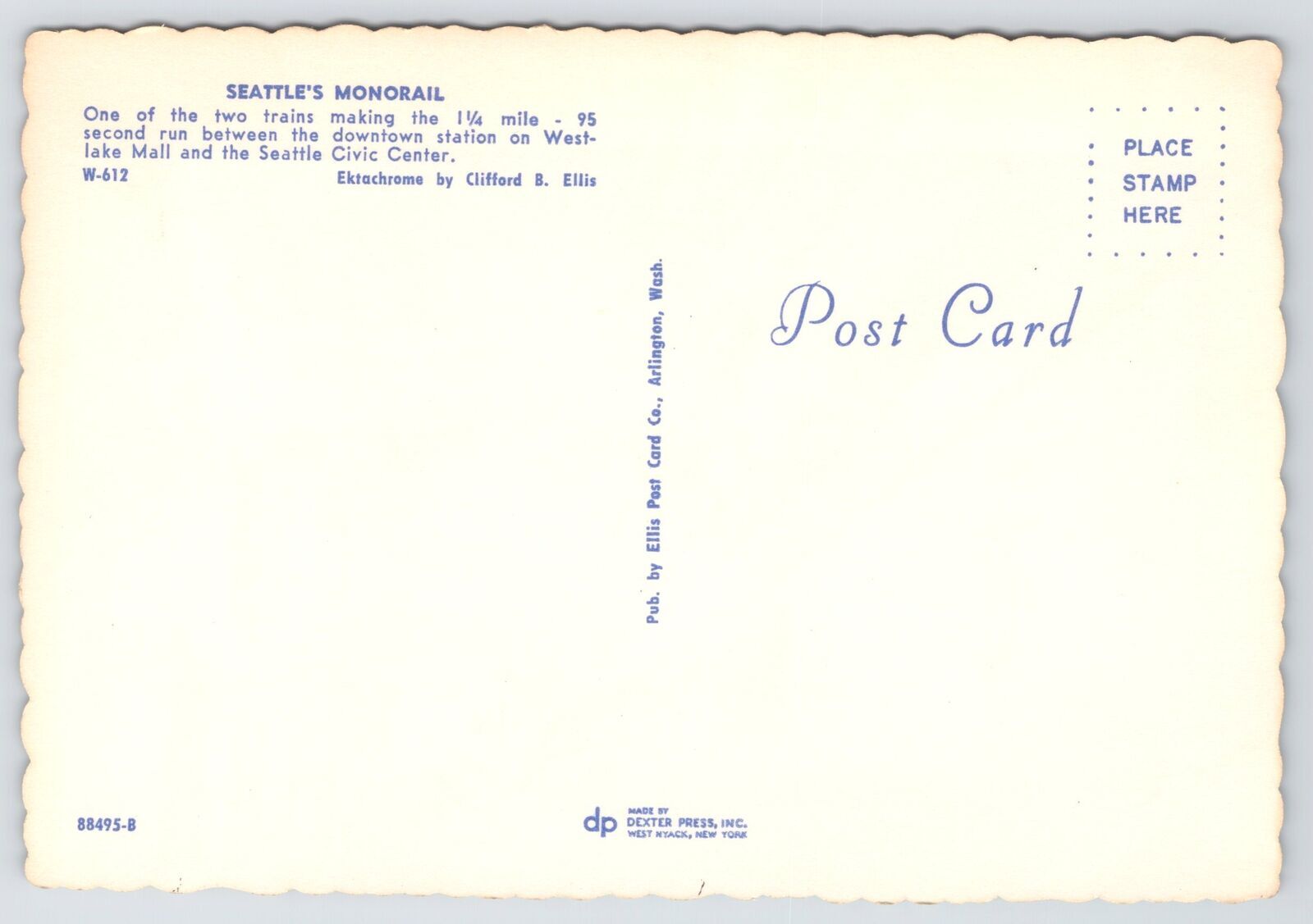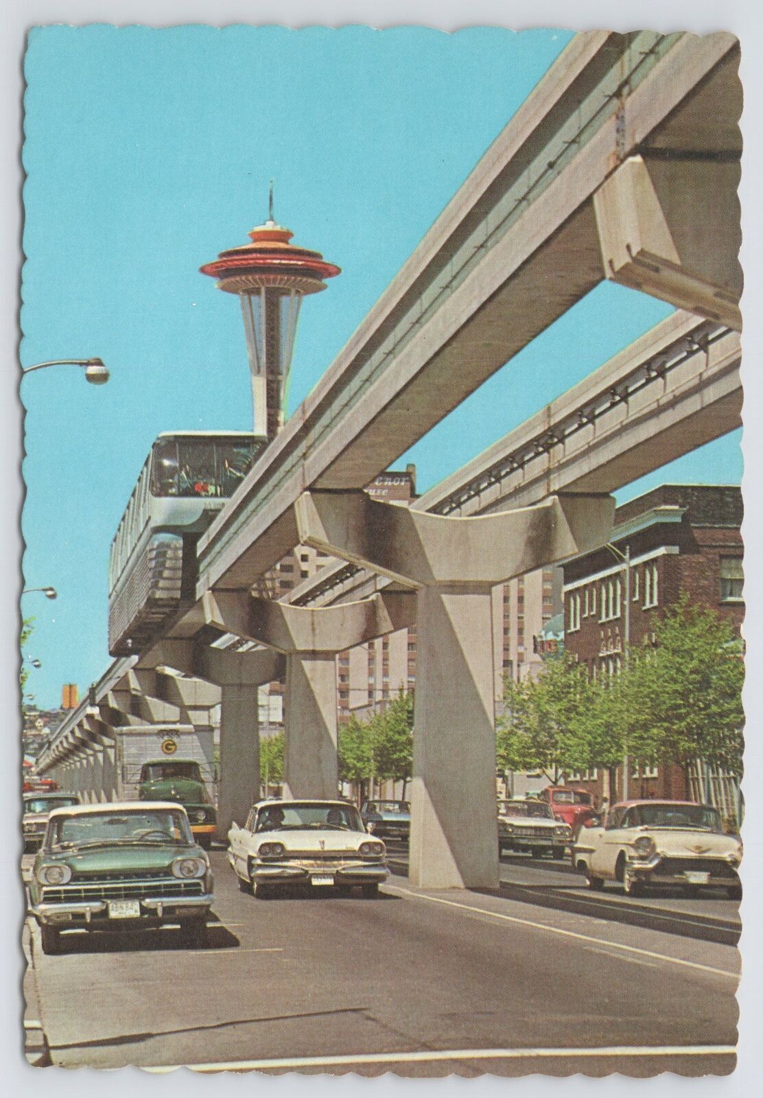 Seattle Washington~Space Needle & Monorail~Classic Cars~Continental Postcard