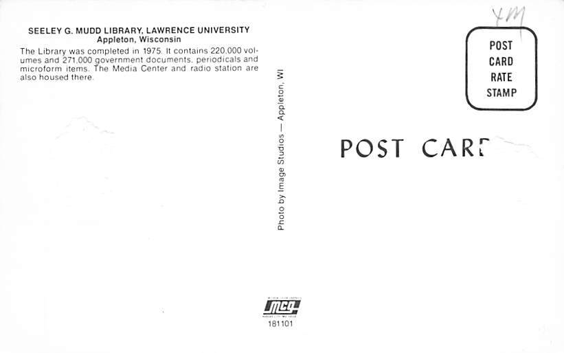 Seeley G. Mudd Library Lawrence University - Appleton, Wisconsin WI Postcard - View Images Grade: 2 - paper wear on back side Size: R - Regular Size Postcard - approximately 3 1/2 inch x 5 1/2 inch (9 CM x 14 CM) ... Read More