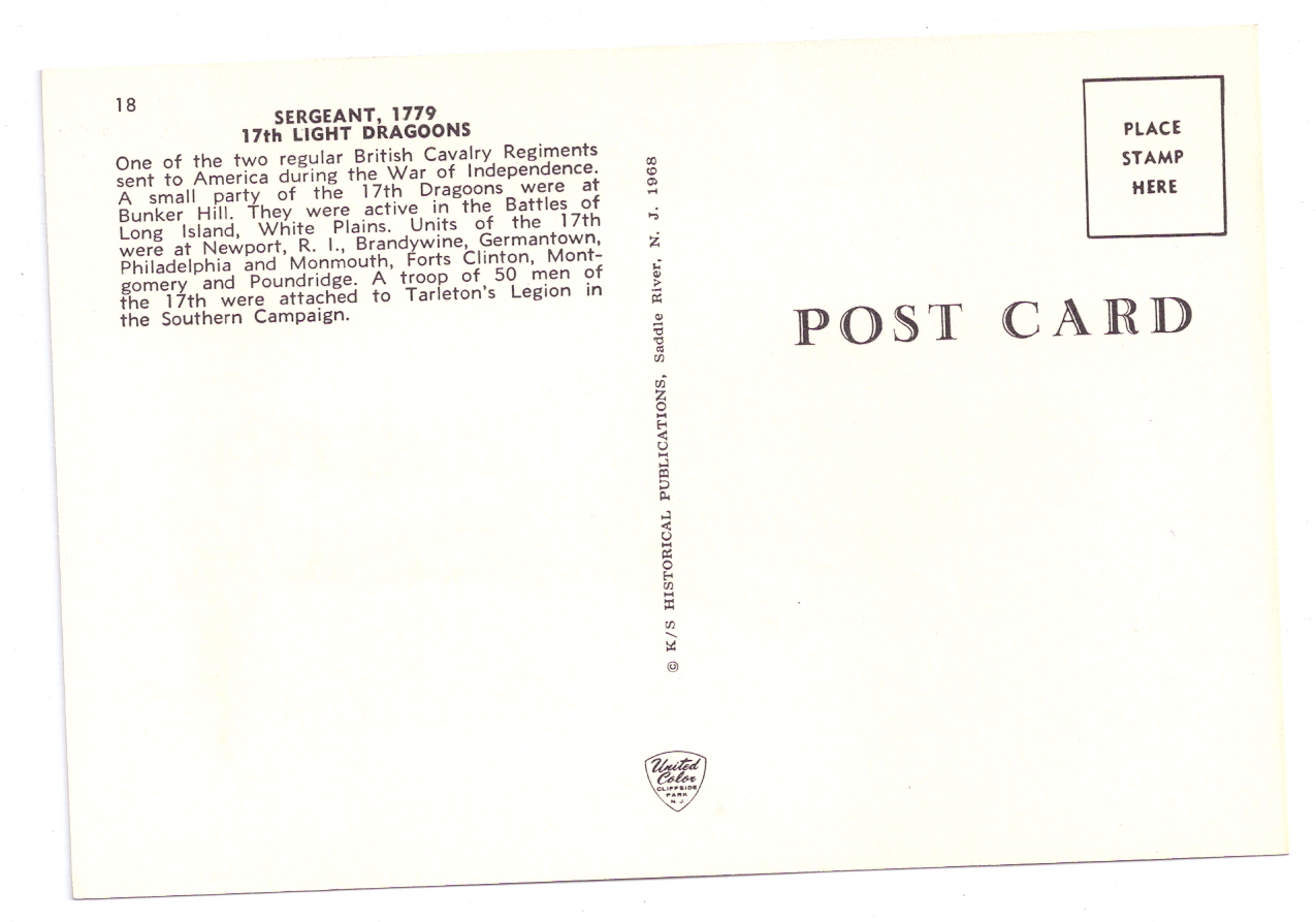 Sergeant Title:  Sergeant 1779 17th Light Dragoons  Description:  ARTIST:   Signed  C. A. Risley (Clyde Risley of Imrie/Risley Military Miniatures) Publisher:    K/S Historical Publicatio ... Read More