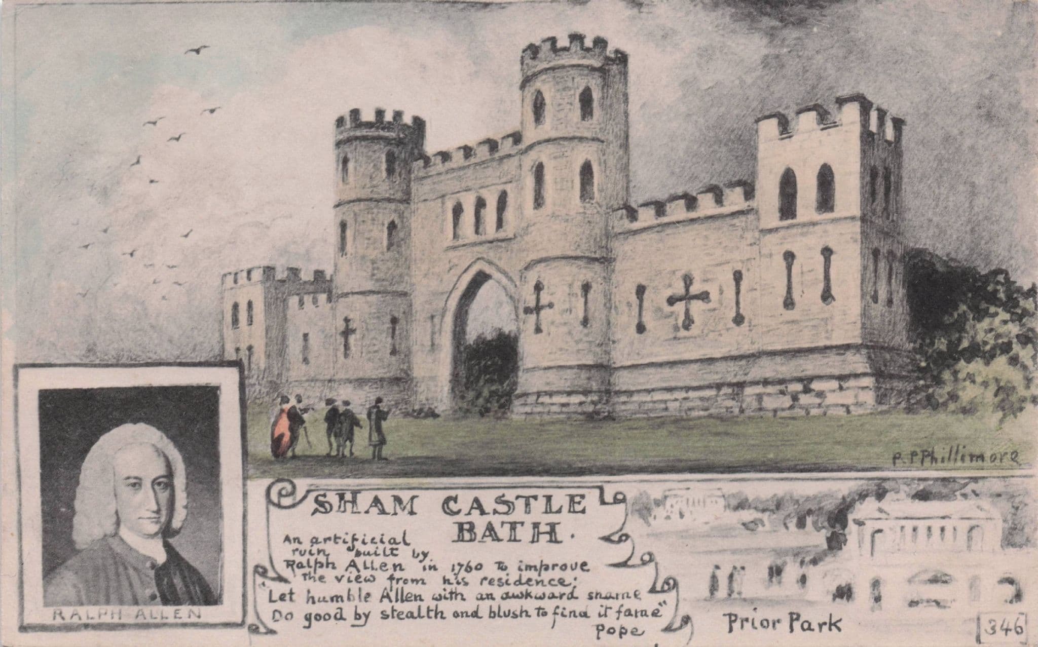 BG664xThis stunning antique illustrator postcard of Sham Castle and with accompanying portraits of Allan Prior and Prior Park named from him (and includes of the Pope too) is from Victorian born historic art illustr ... Read More