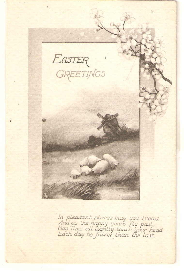 "sheeps pasturing. Windmill. Easter message" tuck easter greetings pc # 960Publisher: : RAPHALEL TUCK & FILD LTD.