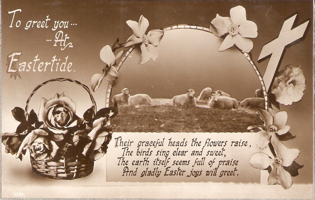"sheeps resting. Flowers. Easter message" nice vintage english easter greetings postcard
