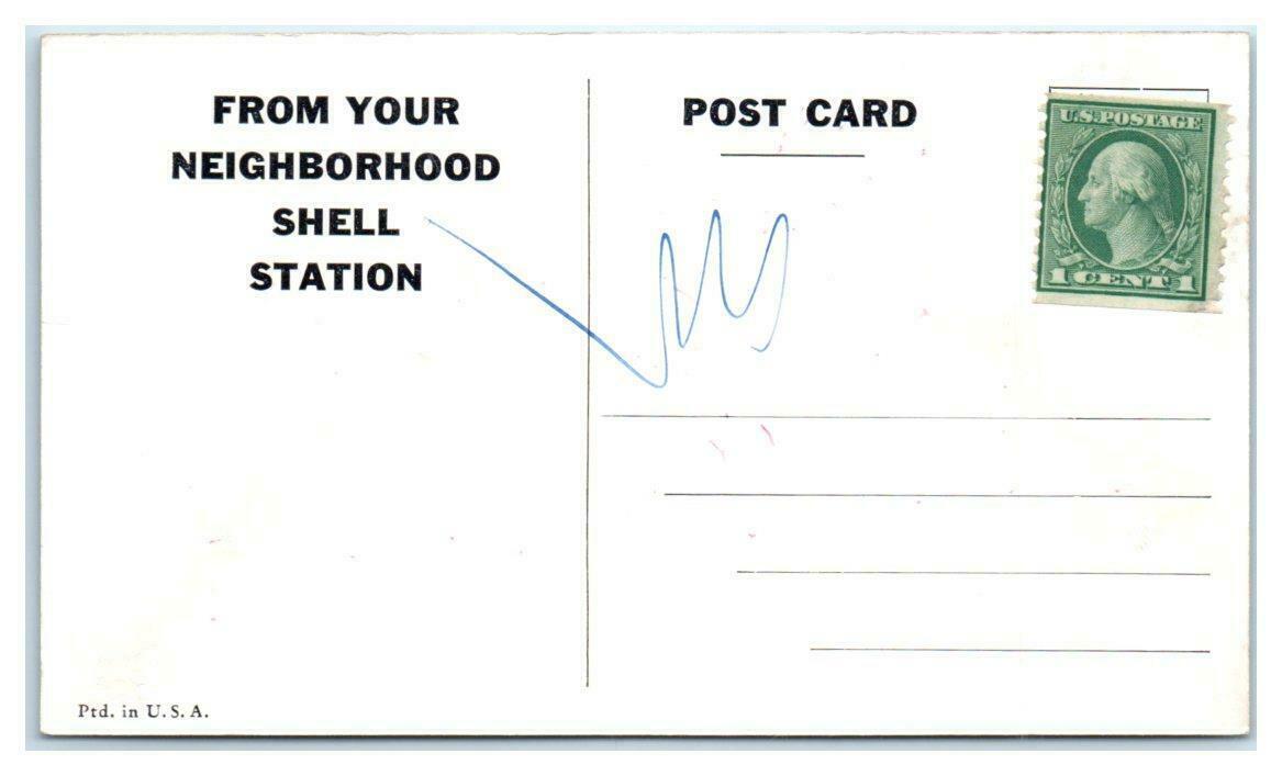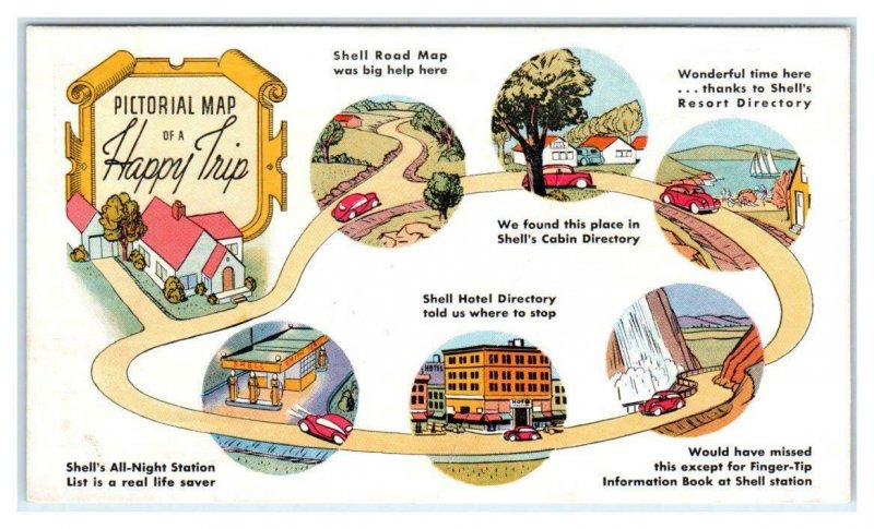 SHELL GAS STATIONS ~ "HAPPY TRIP" Advertising c1940s Multiview Artist Postcard