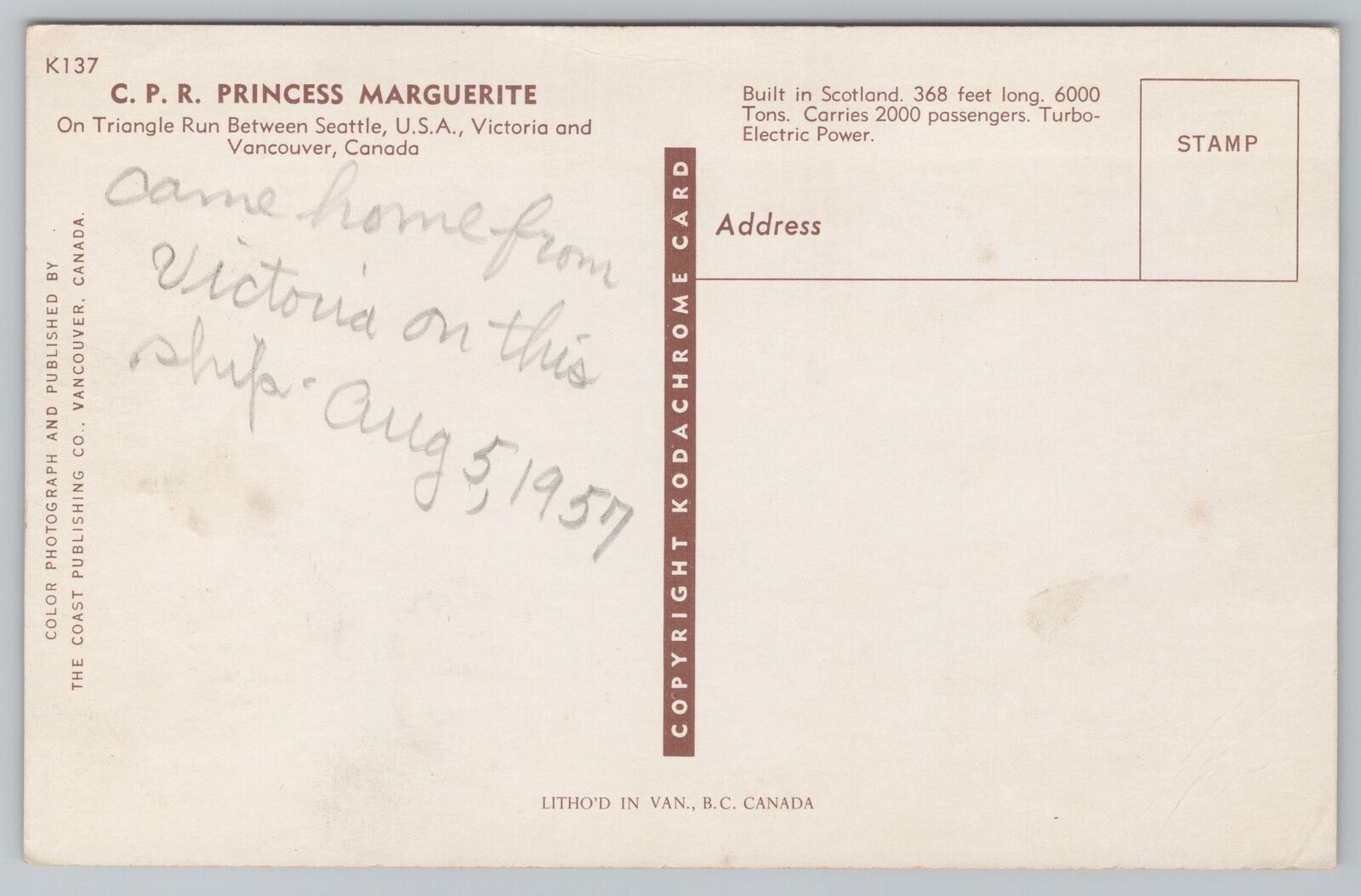 Ship~CPR Princess Marguerite~Triangle Run~Seattle Washington~Vintage Postcard
