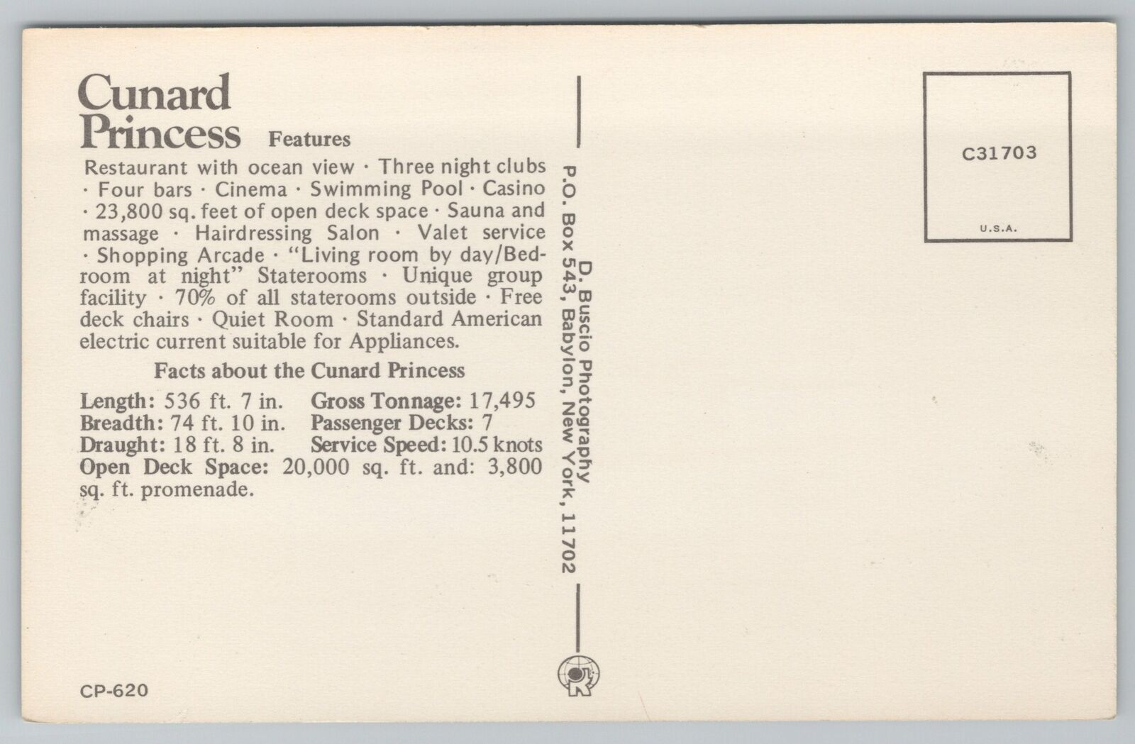 Ship~Cunard Princess & Stats On Back~Vintage Postcard