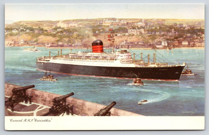 Ship~Cunard RMS Carinthia Steam Oceanliner~City Harbor~Cannons~1940s Postcard