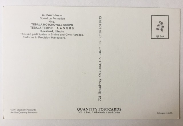 Shows the TebaA Motorcycle Corps of the Tenaglia Temple Shriners in Rockford, Illinois. Card copyright 2001. In very good to excellent condition.
