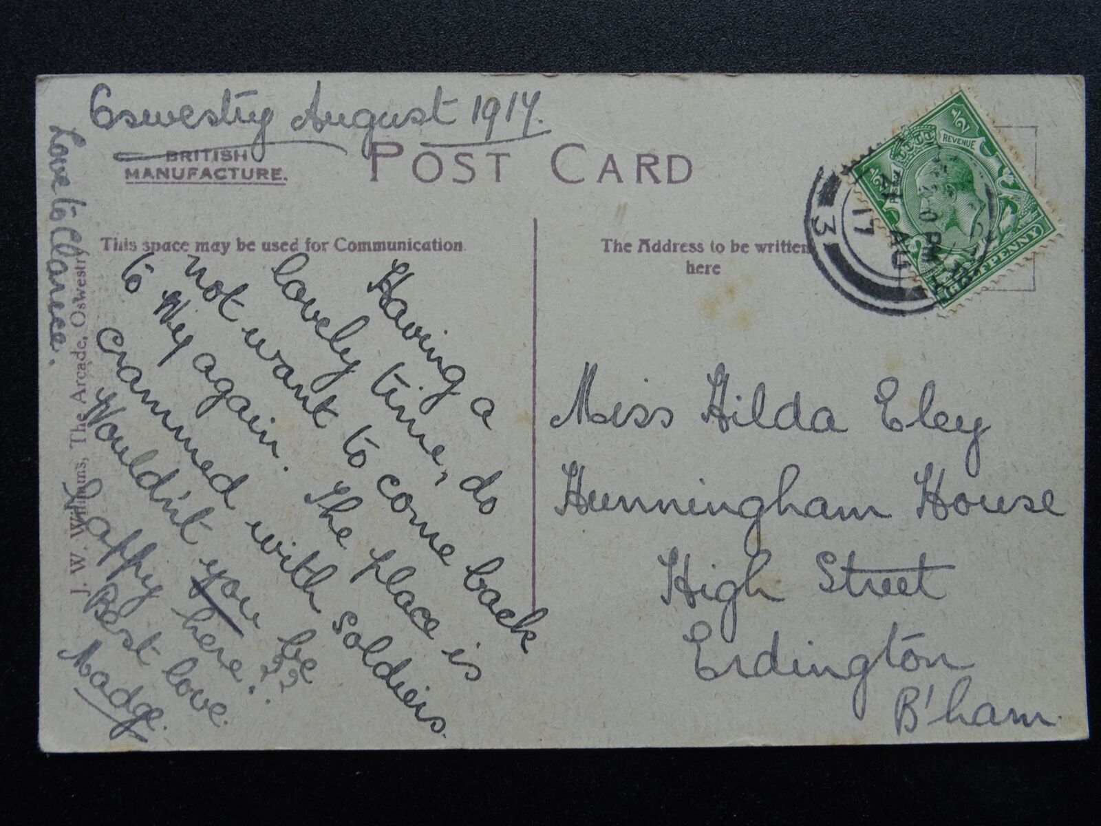 Shropshire OSWESTRY Castle Grounds c1917 Postcard by Valentine Shropshire OSWESTRY Castle Grounds c1917 Postcard by Valentine Postcard Details Additional Information - Postcard Condition (VG) - Very Good / Postally - used / Postcard Details - Please see detail on the photographic image or contact us for details. Abbreviations: (UB) Undivided Back / (RP) Real Photograph Postcard / (PM) Postmark Interest / (CDS) Cancellation Date Stamp / (SQC) Squared Circle / (DP) Duplex PostmarkPTP Reference - 240822 Postcards WelcomeWelcome to our store. At Past Time Postcards we stock a comprehensive range of British antique and vintage topographical postcards, cigarette cards, rare antique prints and other antique collectables.We aim to make your shopping experience enjoyable and stress free. We list our postcards topographically and by subject matter to make it easier for you to locate the items that interest you. Feel free to browse and explore at your leisure, however if you require assistance locating items or have a specific request please don't hesitate to contact us.Combined Postage We will always combine postage when you purchase multiple items. Please make your multiple purchases by using your Hip BASKET where postage will be combined automatically.Postage & PackagingPostage rates are calculated to include postage and packaging. All Full Sets of Cigarette or Trade Cards are posted 1st Class and protected with a plastic sleeves in a BOARD BACKED ENVELOPE & FULL SET HAVE ADDED STIFFNER BOARD for added security and protection. Payment MethodsOur preferred method of payment is through PayPal for all purchases.UK CUSTOMERS can make payment by PayPal, Personal Cheque or Postal Order. PLEASE NOTE: Credit cards included in PayPal payment method Inc. Visa, MasterCard, American Express, Discover. FOR CUSTOMERS OUTSIDE THE UK: we can only accept PayPal as method of payment100% SatisfactionIf in the unlikely event you are unhappy with your item you have purchased on the basis that the postcard was incorrectly described or graded we do offer a complete refund less the cost of postage and packaging once the item is returned to us.Condition & Grading Information(M) Mint – Like new, almost perfect(EX) Excellent – No obvious flaws, sharp corners, clean and if postally used the writing does not detract from appearance.(VG) Very Good - Minor defects such as album marks, signs of age and handling is acceptable that do not detract from appearance.(G) Good – Noticeable defects, handling and wear apparent. Minor creasing or minor postal damage not detrimental to image.(F) Fair – Obvious creasing, staining, small tears or damp damage evident. Significant edge or corner damage.(P) Poor – Incomplete or image seriously affectedFinally if you have any specific requests or questions we are always very pleased to offer support and assist you with your collecting needs.Kind regardsMark - Past Time Postcards Listing and template services provided by inkFrog