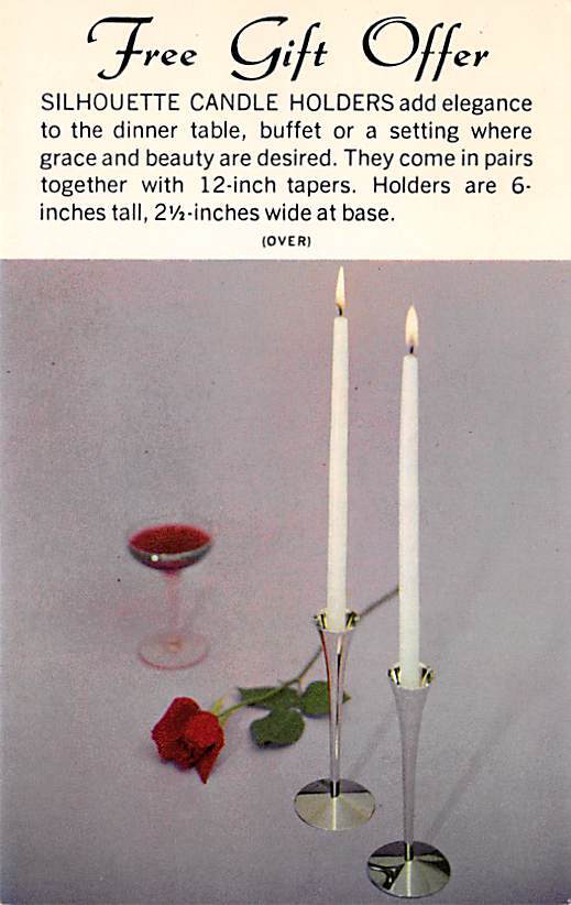 Silhouette Candle Holders Postcard Silhouette Candle Holders, Grade: 1 Size: Regular Size Postcard - approximately 3 1/2 inch x 5 1/2 inch (9 CM x 14 CM) Grading Scale: Grade 1 = Perfect corners Grade 2 = Very ... Read More