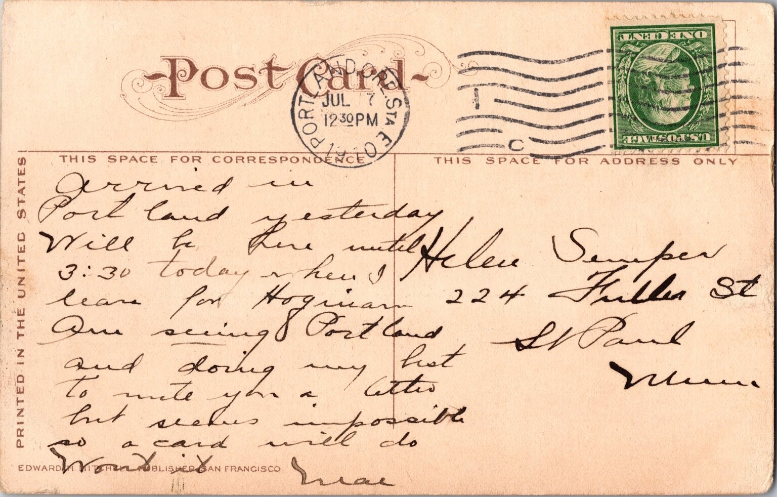 Discover the majestic beauty of Silver Creek Falls, Salem, Oregon, captured on this vintage postcard published by Edward H. Mitchell of San Francisco. The vibrant hand-colored image depicts the powerful cascade of the falls, framed by lush, towering trees, reflecting the serene natural landscape of the Pacific Northwest. This scenic view offers a glimpse into Oregon's picturesque wilderness from the early 20th century.The reverse side of this collectible piece features a clear postmark from Portland, Oregon, dated July 7, along with a one-cent George Washington U.S. postage stamp, indicative of its early 1900s mailing. A handwritten message details travel plans, adding a personal historical touch to this beautiful depiction of Silver Creek Falls. This postcard is a wonderful piece for collectors of Oregon memorabilia, waterfall scenes, or early American postcards.
