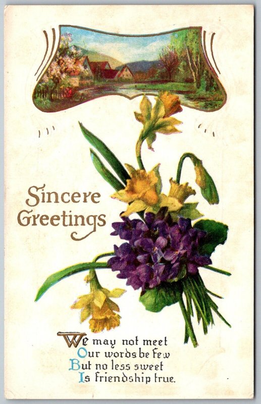 Sincere Greetings c1910 Embossed Postcard Farm Scene Flowers Poem