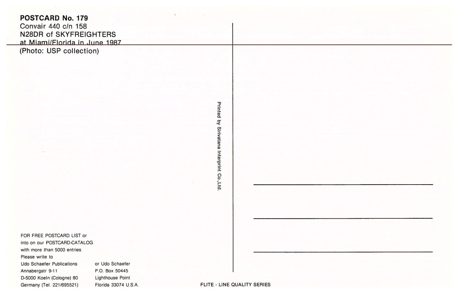 Condition: Pre-owned. May have mild edgewear, typical. Stored well. Some discoloration on the back, typical. This postcard features a stunning image of a Skyfreighters Convair 440 at Miami in 1987. Printed on high- ... Read More