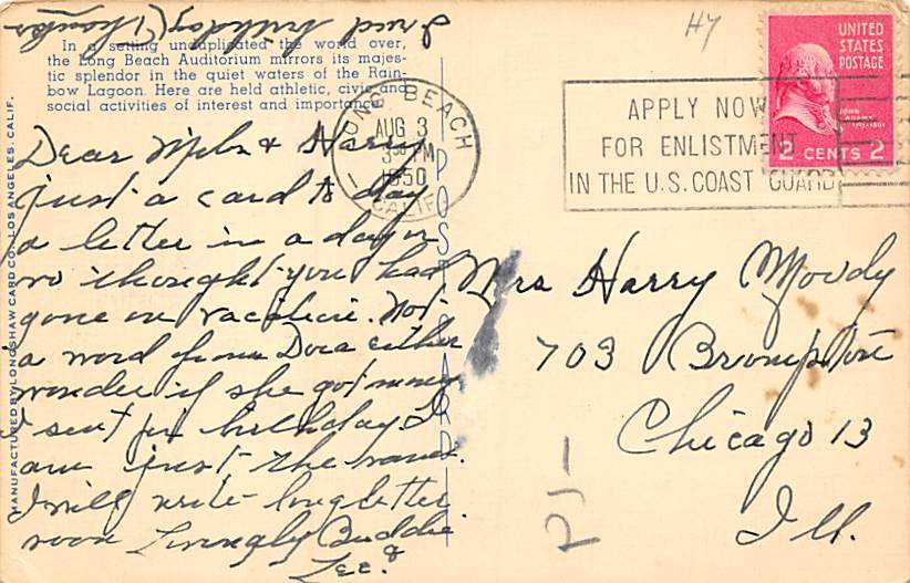 Skyline and Municipal Auditorium Long Beach CA Postcard - 1950 Grade: 3 Size: R - Regular size: Approx 3 1/2 X 5 1/2 inch (9 cm X 14 cm) Grading Scale: Grade 1 = Perfect corners Grade 2 = Very Minimal corner w ... Read More