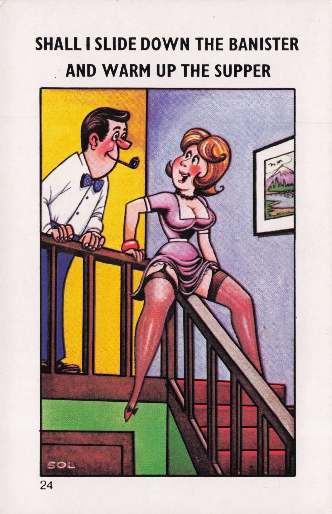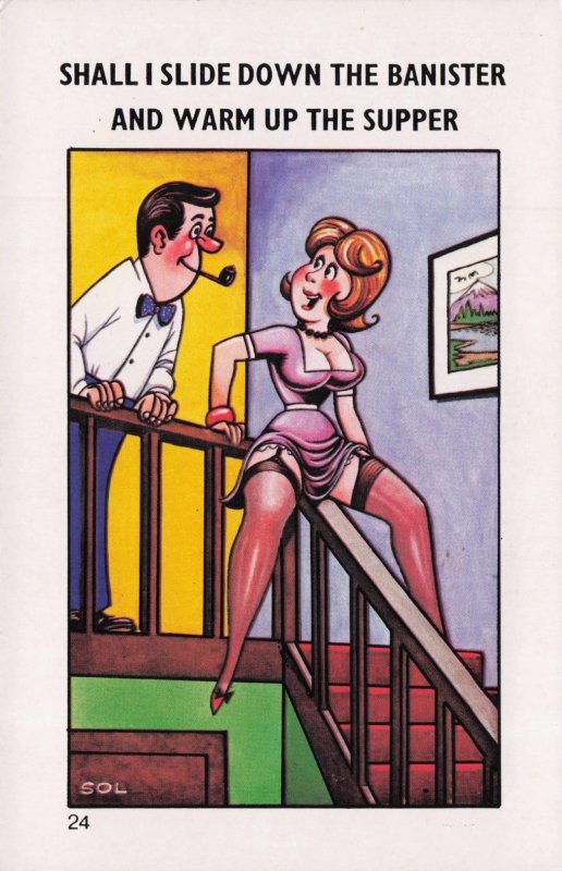 Sliding Down The Bannister Sexy Lady Pipe Smoking Comic Postcard