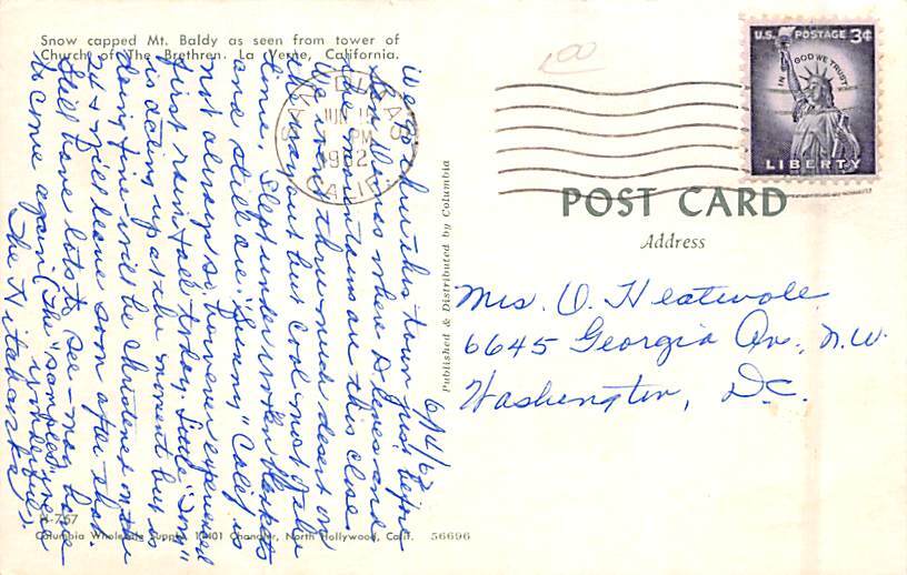 Snow capped Mt. Baldy La Verne CA Postcard - 1962 Grade: 2 Size: R - Regular size: Approx 3 1/2 X 5 1/2 inch (9 cm X 14 cm) Grading Scale: Grade 1 = Perfect corners Grade 2 = Very Minimal corner wear, no creas ... Read More