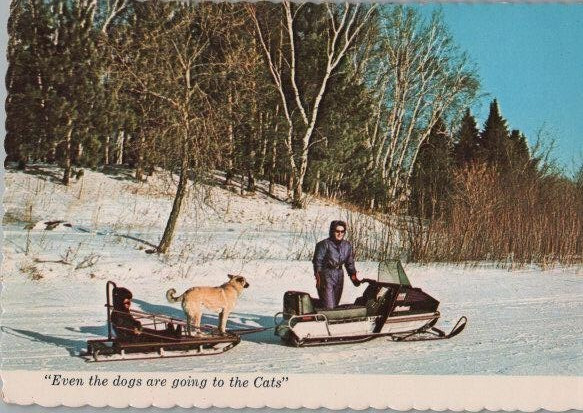 Snowmobiling in Winter Dogs Cats Continental Chrome Postcard