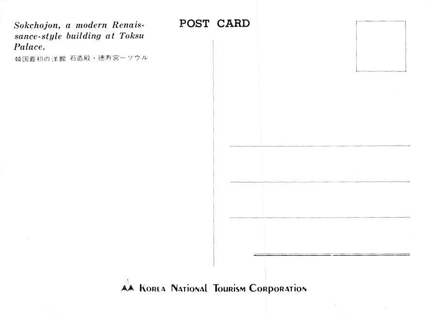 Sokchojon Toksu Palace, Korea Grade: 1 Size: Continental Size - approximatly 4 Inch x 6 Inch (15 cm x 10.5) Grading Scale: Grade 1 = Perfect corners Grade 2 = Very Minimal corner wear, no creases Grade 3 = Som ... Read More
