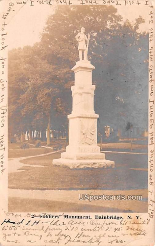 Soldiers Monument Bainbridge NY Year Date of Postcard, or Postal Used / Year Used: 1907 Grade: 4 Product Size: R Product Type: 8 Grading Scale: Grade 1 = Perfect corners Grade 2 = Very Minimal corner wear, n ... Read More