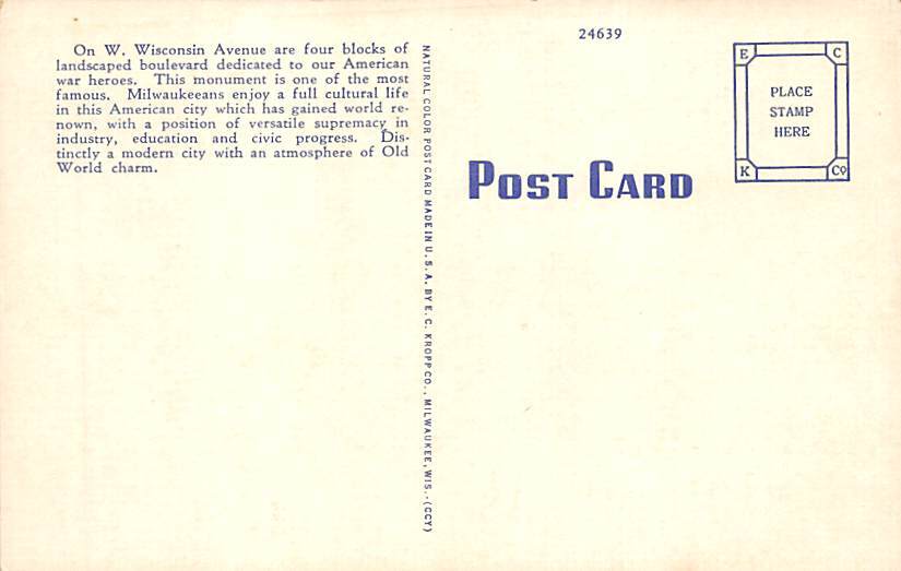 Soldier's Monument Court Of Honor Milwaukee WI Grade: 1 Size: Regular Size Postcard - approximately 3 1/2 inch x 5 1/2 inch (9 CM x 14 CM) Grading Scale: Grade 1 = Perfect corners Grade 2 = Very Minimal corner ... Read More