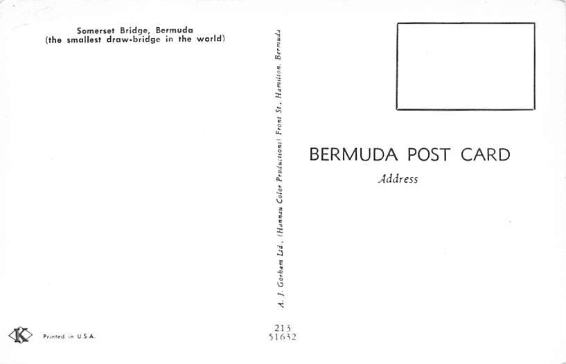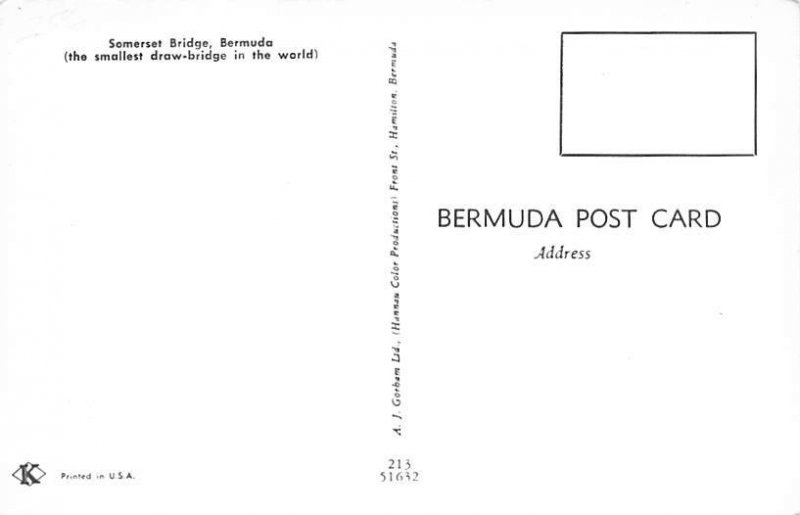 Somerset Bridge Bermuda Postcard Postal Date: {{Product Field 4 ( Postal Used, Unused)}} Grade: 1 Size: Regular Size Postcard - approximately 3 1/2 inch x 5 1/2 inch (9 CM x 14 CM) Grading Scale: Grade 1 = Pe ... Read More