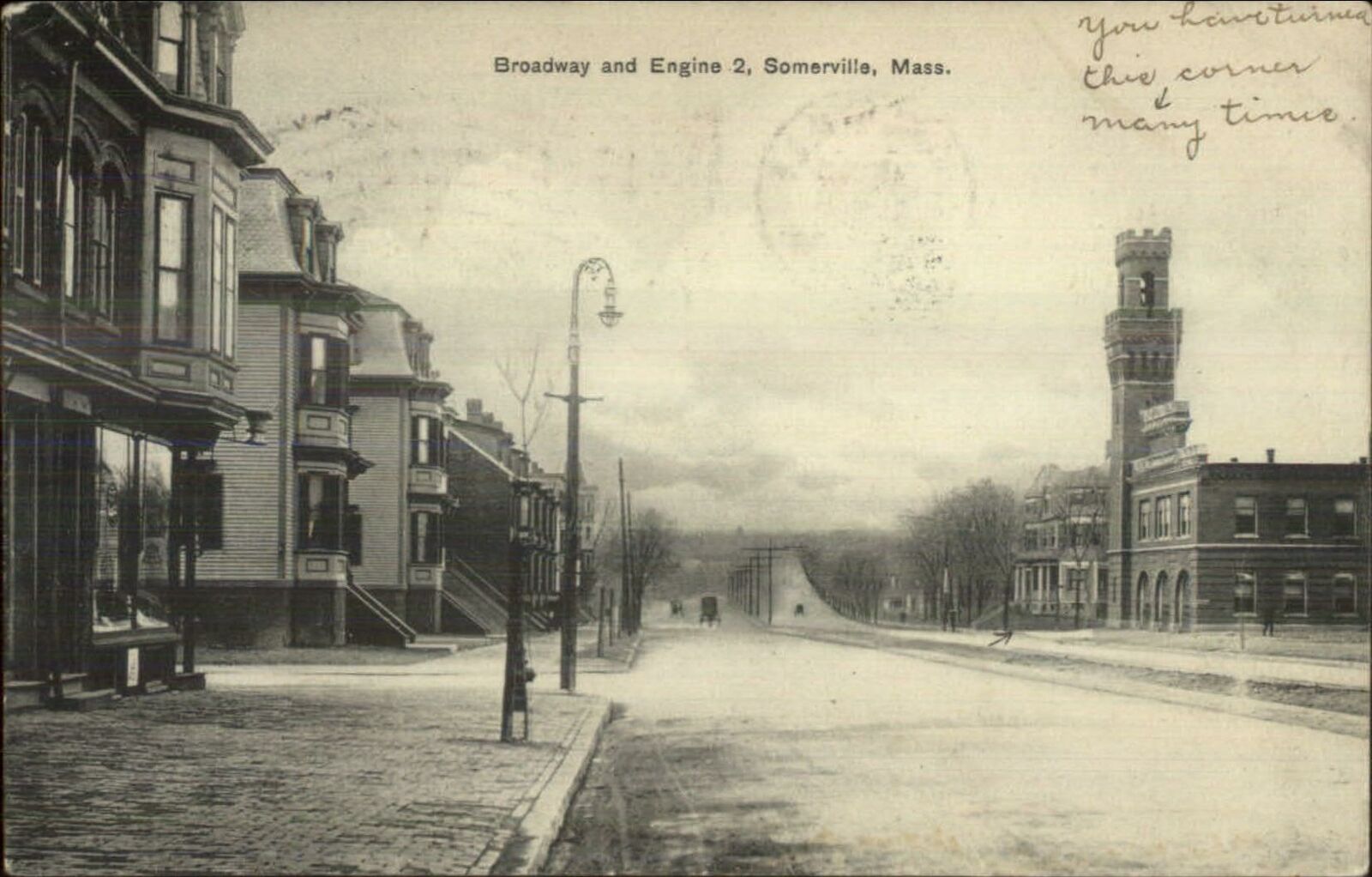 Somerville MA Broadway & Engine 2 Fire Station c1910 Postcard