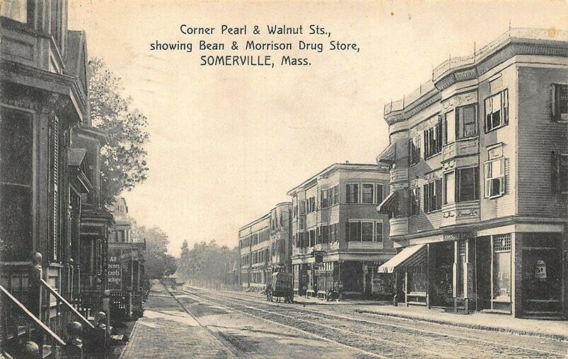 Somerville MA Corner Pearl & Walnut Bean & Morrison Drug Store, postcard.