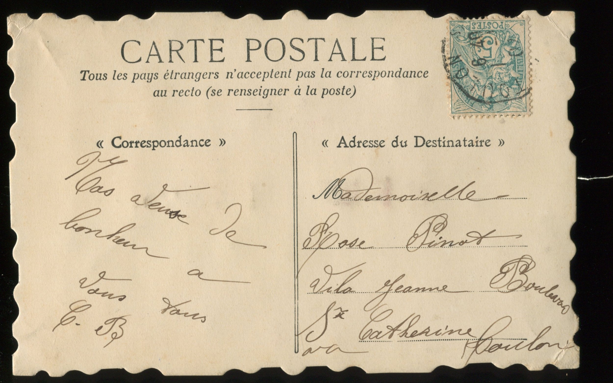 Souhaits Sinceres. 1907 French mechanical postcard. Pulling on yellow ribbon causes bouquet and then the girl to lift out from the background. Three corner tips are creased. Scuffed spots on two corners possibly indicate loss of a decoration. Ribbon has a pulled thread.Seller Information