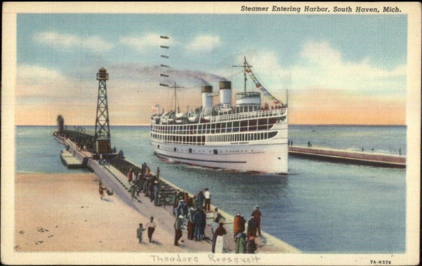 South Haven MI Steamer Ship Entering - Lighthouse Linen Postcard