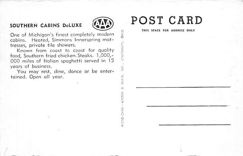 Southern Cabins Deluxe Michigan's Finest Cabins Grand Rapids MI Grade: 1 Size: Regular Size Postcard - approximately 3 1/2 inch x 5 1/2 inch (9 CM x 14 CM) Grading Scale: Grade 1 = Perfect corners Grade 2 = Ver ... Read More