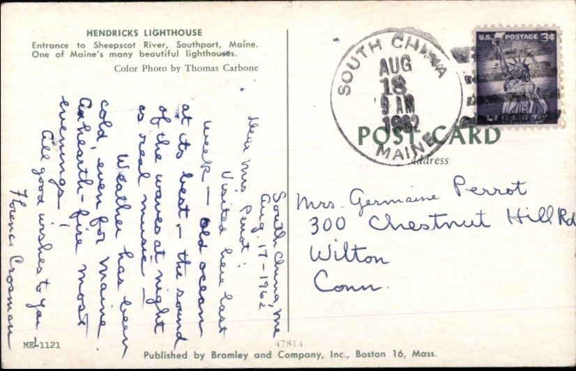 Southport ME Hendricks Head Lighthouse c1950s Postcard